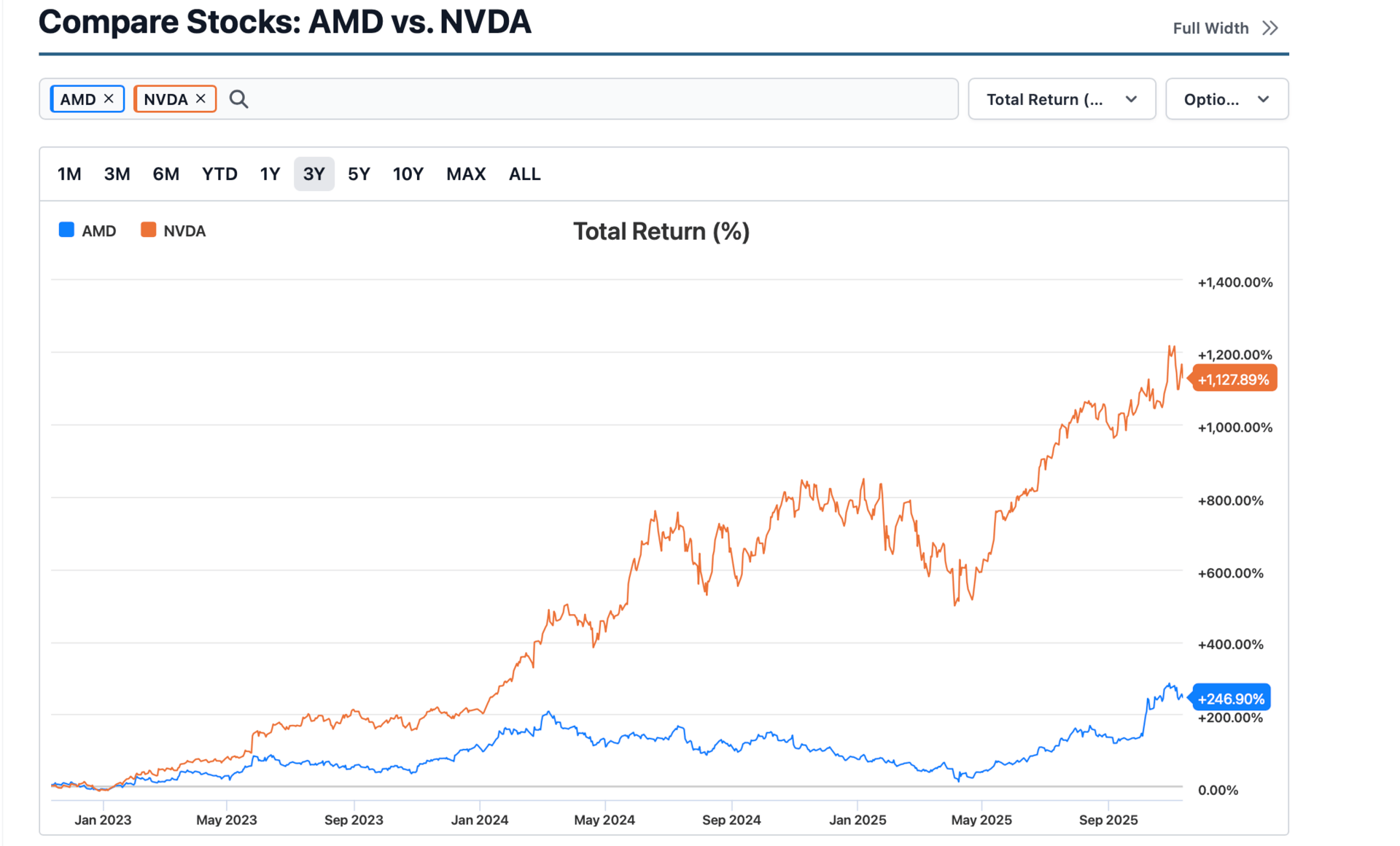 If you pull up AMD vs NVDA on Stock Analysis, you’ll see how wide the gap is: NVDA +1,127% vs AMD +247% over the past three years.